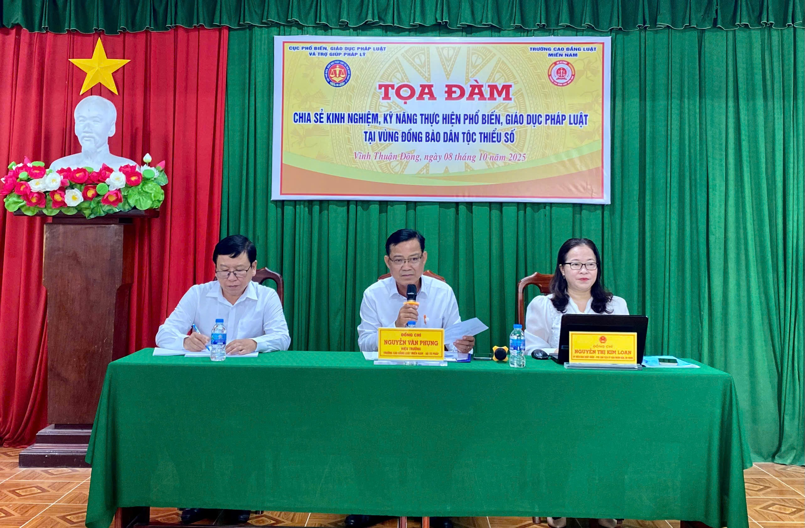 Tại tọa đàm, các đại biểu nghe đại diện Ủy ban nhân dân xã Vĩnh Thuận Đông chia sẻ về thực trạng thực hiện phổ biến, giáo dục pháp luật tại vùng dân tộc thiểu số. Với đặc điểm điều kiện kinh tế - xã hội còn khó khăn, khả năng tiếp cận thông tin pháp luật của đồng bào dân tộc thiểu số tại các ấp còn hạn chế. Đối với việc phổ biến giáo dục ở địa bàn có đông đồng bào dân tộc thiểu số, địa phương xác định là nhiệm vụ quan trọng; ưu tiên của chính quyền trong việc triển khai đường lối, chủ trương, pháp luật đến đồng bào dân tộc thiểu số nhằm cung cấp, trang bị cho đồng bào dân tộc thiểu số những kiến thức, hiểu biết pháp luật; từ đó, hình thành ý thức tôn trọng, tuân theo pháp luật, biết sử dụng pháp luật một cách chủ động, tích cực và đúng đắn, góp phần phát huy vai trò, hiệu lực của pháp luật trong thực tiễn đời sống kinh tế - xã hội của đồng bào dân tộc thiểu số; bảo đảm quyền con người, quyền công dân, quyền được thông tin về pháp luật, xây dựng hệ thống chính trị ở cơ sở vững mạnh, giữ vững an ninh chính trị, trật tự an toàn xã hội, đảm bảo an ninh biên giới quốc gia và cải thiện đời sống tinh thần của Nhân dân; hướng tới giảm nghèo bền vững. Từ đó, tình hình an ninh trật tự được giữ vững, đời sống văn hóa tinh thần của đồng bào dân tộc thiểu số có bước chuyển đáng ghi nhận.