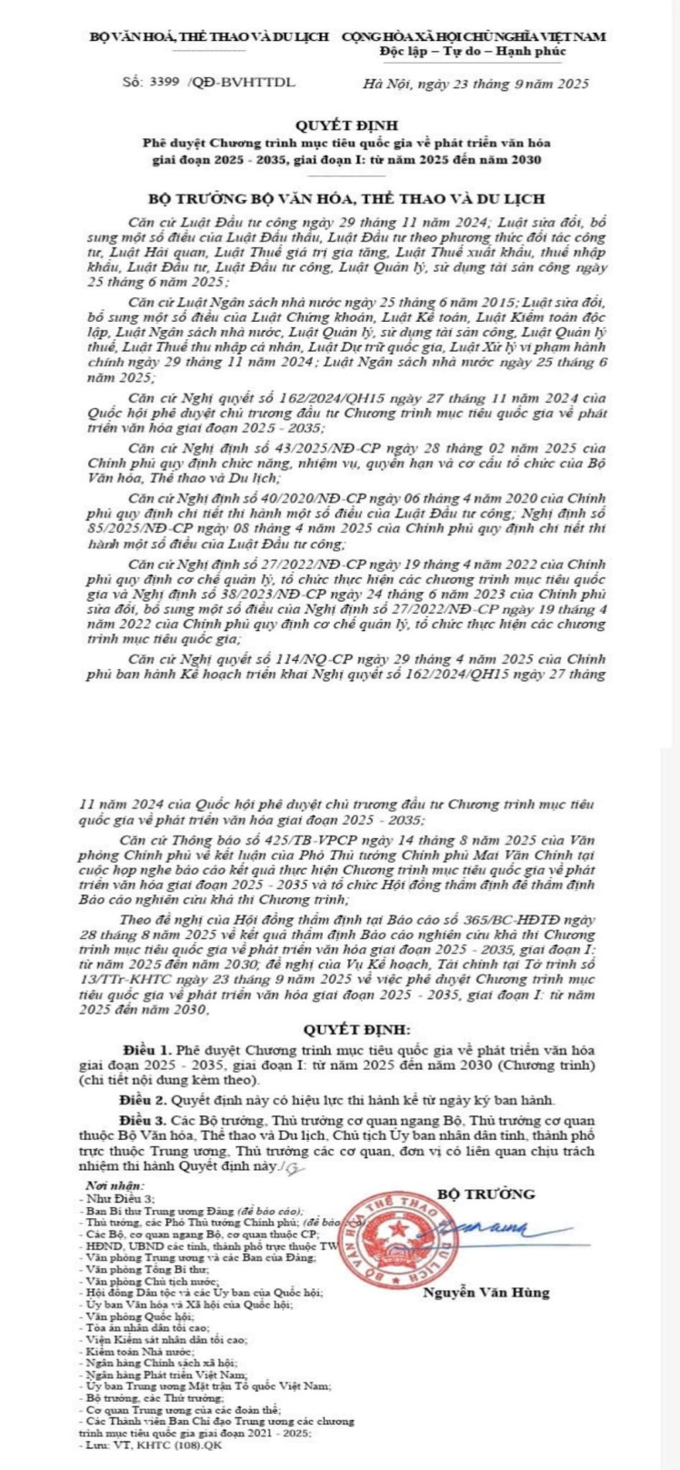 Nhằm thực hiện Nghị quyết số 162/2024/QH15 ngày 27 tháng 11 năm 2024 của Quốc hội về phê duyệt chủ trương đầu tư Chương trình mục tiêu quốc gia về phát triển văn hóa giai đoạn 2025 - 2035 (Nghị quyết số 162/2024/QH15), ngày 23/9/2025, Bộ trưởng Bộ Văn hóa, Thể thao và Du lịch đã ban hành Quyết định số 3399/QĐ-BVHTTDL phê duyệt Chương trình mục tiêu quốc gia về phát triển văn hóa giai đoạn 2025 - 2035, giai đoạn I: từ năm 2025 đến năm 2030 (Chương trình)