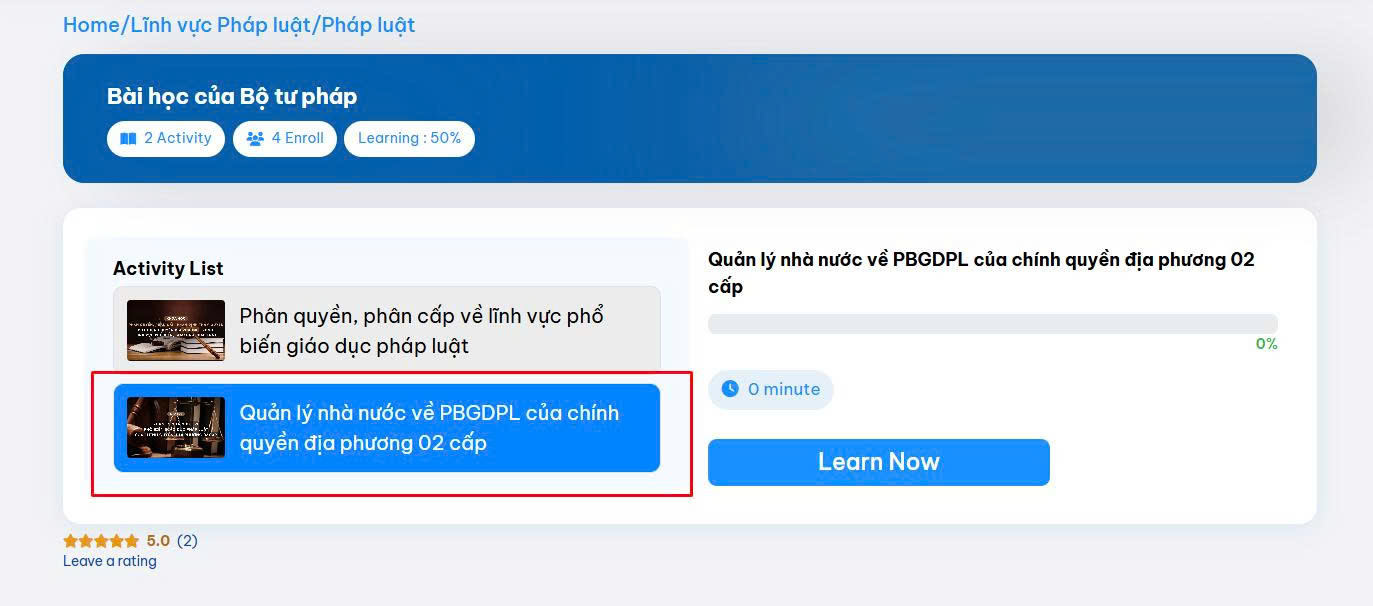 Khóa tập huấn kiến thức phân quyền, phân cấp, quản lý nhà nước về PBGDPL của chính quyền địa phương 02 cấp gồm 02 phần, phần 1 về các nhiệm vụ phân quyền, phân cấp trong lĩnh vực PBGDPL; phần 2 về quản lý nhà nước về PBGDPL của chính quyền địa phương 02 cấp (mỗi phần có bài giảng khoảng 10 phút).