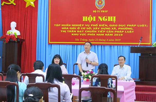 Ngày 22-23/4/2019, tại thành phố Sóc Trăng, Vụ Phổ biến, giáo dục pháp luật, Bộ Tư pháp phối hợp với Sở Tư pháp tỉnh Sóc Trăng tổ chức Hội nghị tập huấn nghiệp vụ phổ biến, giáo dục pháp luật (PBGDPL); hoà giải ở cơ sở; xây dựng xã, phường, thị trấn đạt chuẩn tiếp cận pháp luật cho gần 100 đại biểu là đại diện Lãnh đạo Sở Tư pháp, Lãnh đạo, công chức Phòng phổ biến, giáo dục pháp luật thuộc Sở Tư pháp, báo cáo viên pháp luật cấp tỉnh, báo cáo viên pháp luật cấp huyện của 19 tỉnh, thành phố khu vực phía nam (Bình Phước, Tây Ninh, Bình Dương, Đồng Nai, TP.Hồ Chí Minh, Bà Rịa-Vũng Tàu, Tiền Giang, Long An, Đồng Tháp, An Giang, Cần Thơ, Vĩnh Long, Bến Tre, Hậu Giang, Trà Vinh, Kiên Giang, Sóc Trăng, Bạc Liêu, Cà Mau) và đại diện Lãnh đạo Cục Công tác phía Nam, giảng viên Trường Trung cấp luật Vị Thanh, tỉnh Hậu Giang.