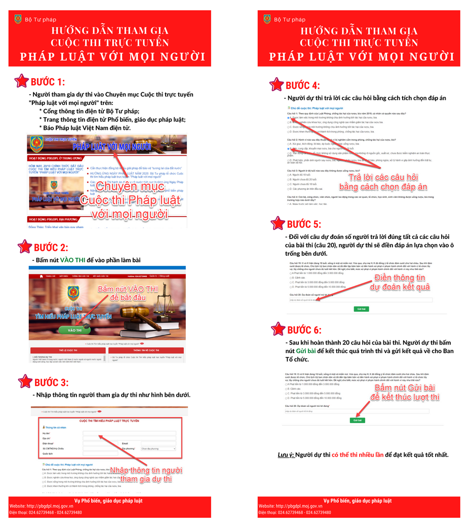 Cuộc thi sẽ diễn ra đến hết ngày 20/11/2020. Để tham gia Cuộc thi, người thi truy cập vào Chuyên mục Cuộc thi trực tuyến “Pháp luật với mọi người” trên Cổng Thông tin điện tử Bộ Tư pháp; Trang tin Phổ biến, giáo dục pháp luật - Bộ Tư pháp và Báo Pháp luật Việt Nam điện tử hoặc website của Cuộc thi theo đường dẫn: https://pbgdpl.moj.gov.vn/qt/cuocthi/Pages/home.aspx./.