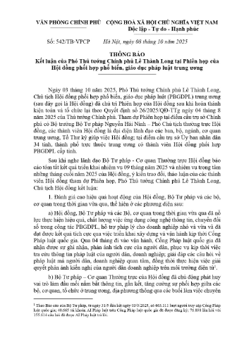 Ngày 08 tháng 10 năm 2025, Văn phòng Chính phủ đã ban hành Văn bản số 542/TB-VPCP thông báo kết luận của Phó Thủ tướng Chính phủ Lê Thành Long, Chủ tịch Hội đồng phối hợp phổ biến, giáo dục pháp luật (PBGDPL) trung ương (sau đây gọi là Hội đồng) tại Phiên họp Hội đồng ngày 03/10/2025.
