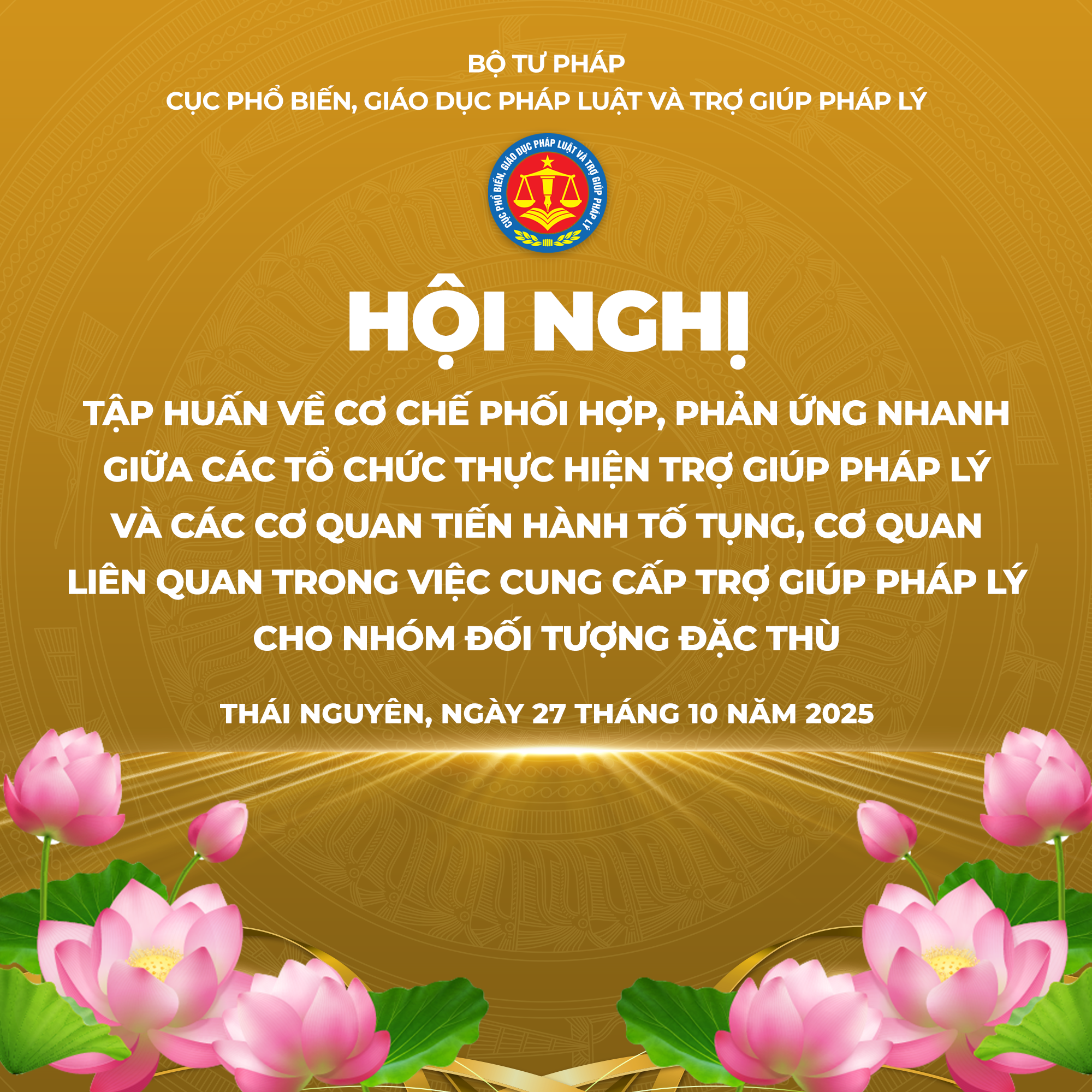 Sáng ngày 04/11, Cục Phổ biến, giáo dục pháp luật và Trợ giúp pháp lý (Bộ Tư pháp) sẽ tổ chức Hội nghị tập huấn về cơ chế phối hợp, phản ứng nhanh giữa các tổ chức thực hiện trợ giúp pháp lý và các cơ quan tiến hành tố tụng, cơ quan liên quan trong việc cung cấp trợ giúp pháp lý cho nhóm đối tượng đặc thù, tại Thái Nguyên.